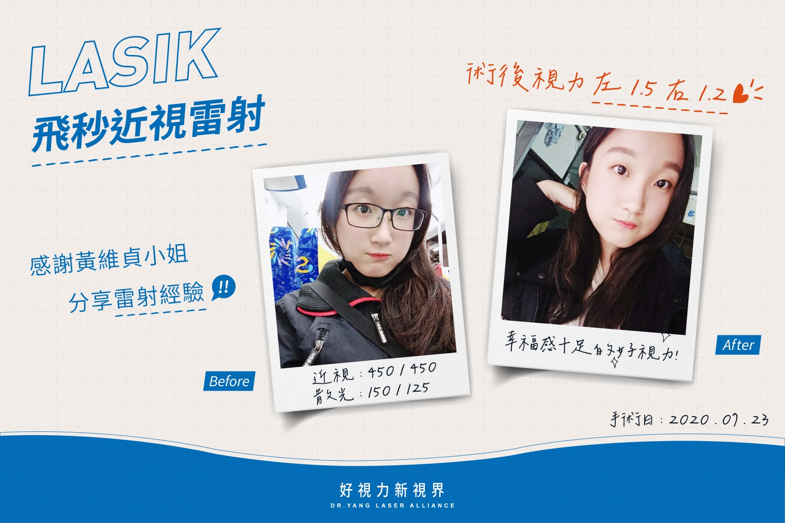手術完,一開始左眼有點不太舒服,於是專員很有耐心的幫我點淚液,讓我眼睛不會不舒服,隔天睡覺醒來一張開眼,發現視野變的清晰但還有點糊糊的,經過兩個禮拜的時間,視野漸漸變的清晰模糊的感覺消失,真的很開心 謝謝楊醫師讓我恢復視力,讓我眼睛變的更好