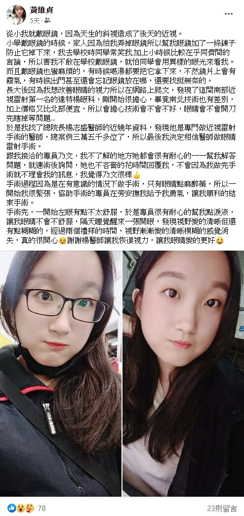 黃維貞小姐在臉書大方分享術後心得↓